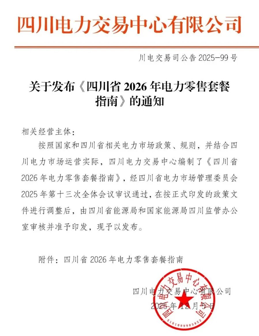 12月5日,四川电力交易中心发布《四川省2026年电力零售套餐指南》通知。详情如下: