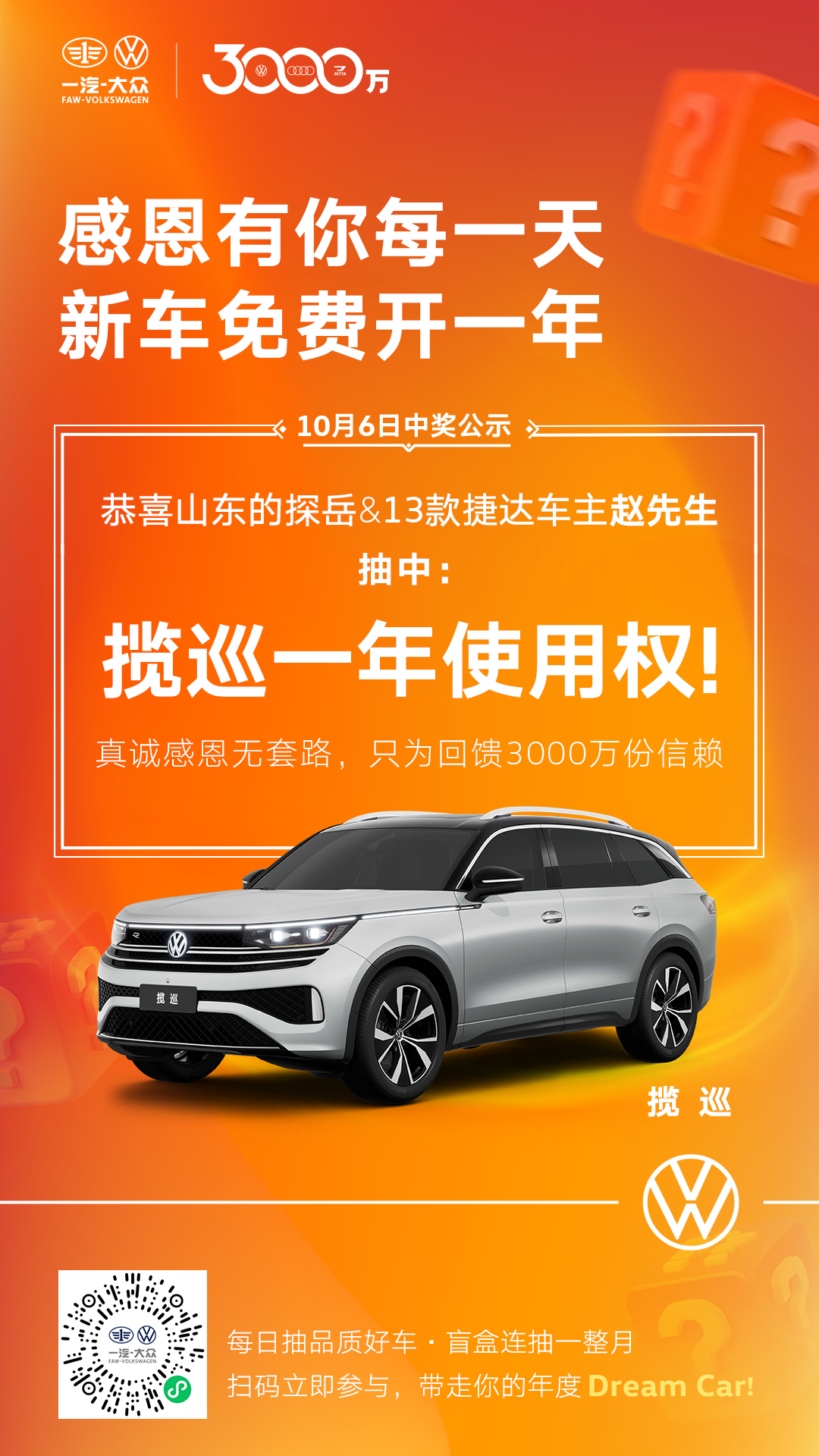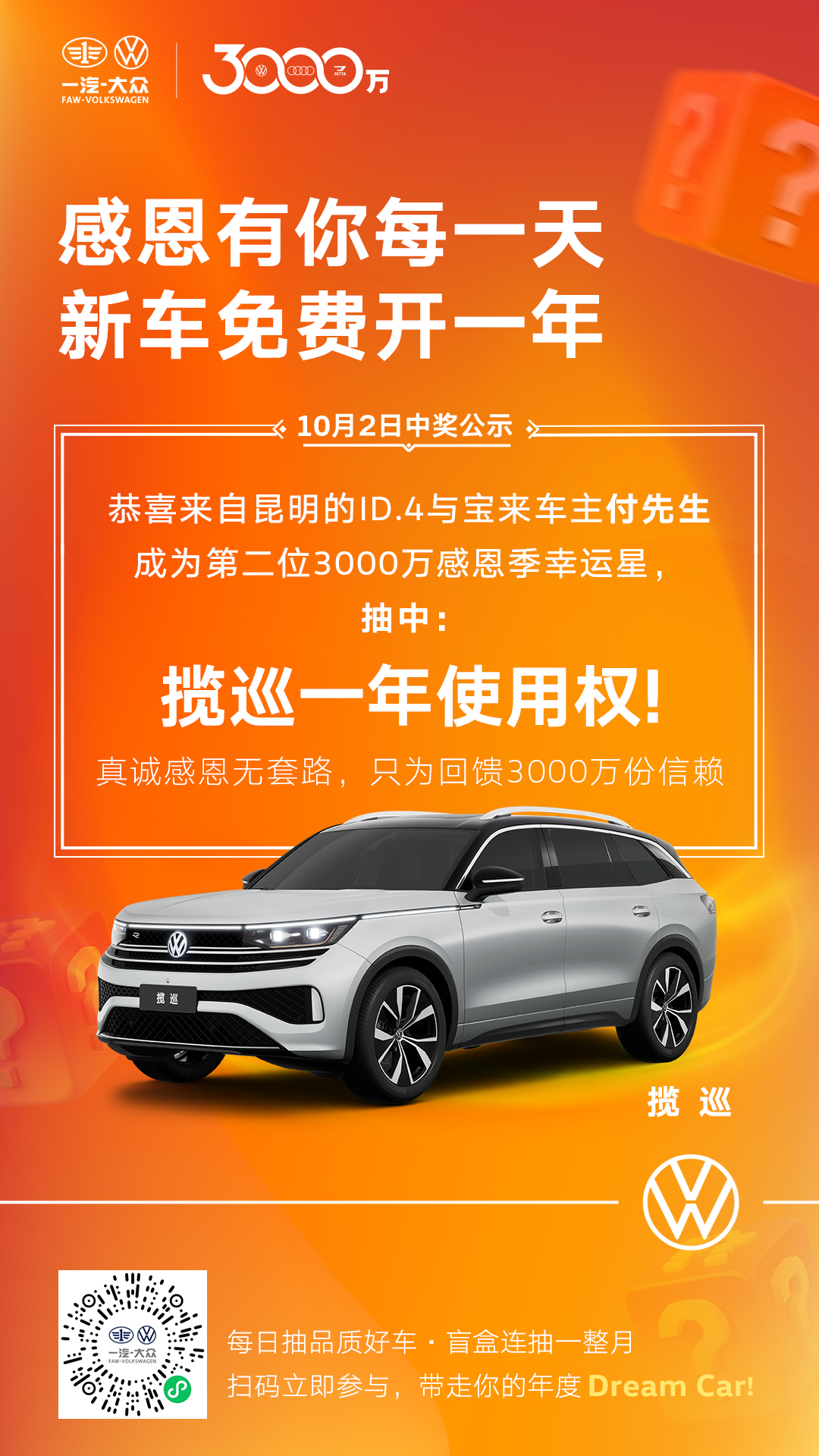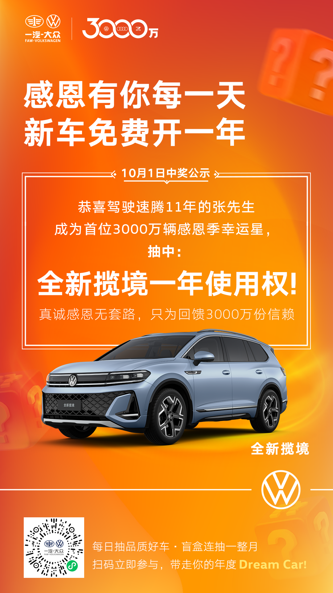 为回馈广大客户的支持与信赖,一汽-大众在即将迎来3000万辆整车下线里程碑之际,特别推出了“3000万客户感恩礼”活动,广大车主报名即可抽取新车1年使用权。一汽-大众大众品牌于10月1日-28日期间每日准时开奖、真实兑现,5大车型连送30台。自9月30日活动启动至今,已吸引超过64000位大众品牌车主报名参与,十一长假期间共诞生了八位“幸运星”,分别获得全新揽境、揽巡、全新探岳L、全新速腾L及全新一代迈腾车型的一年使用权。