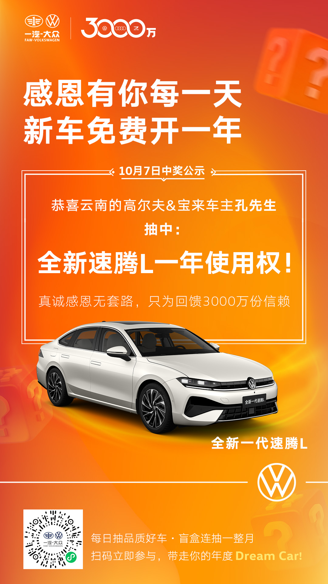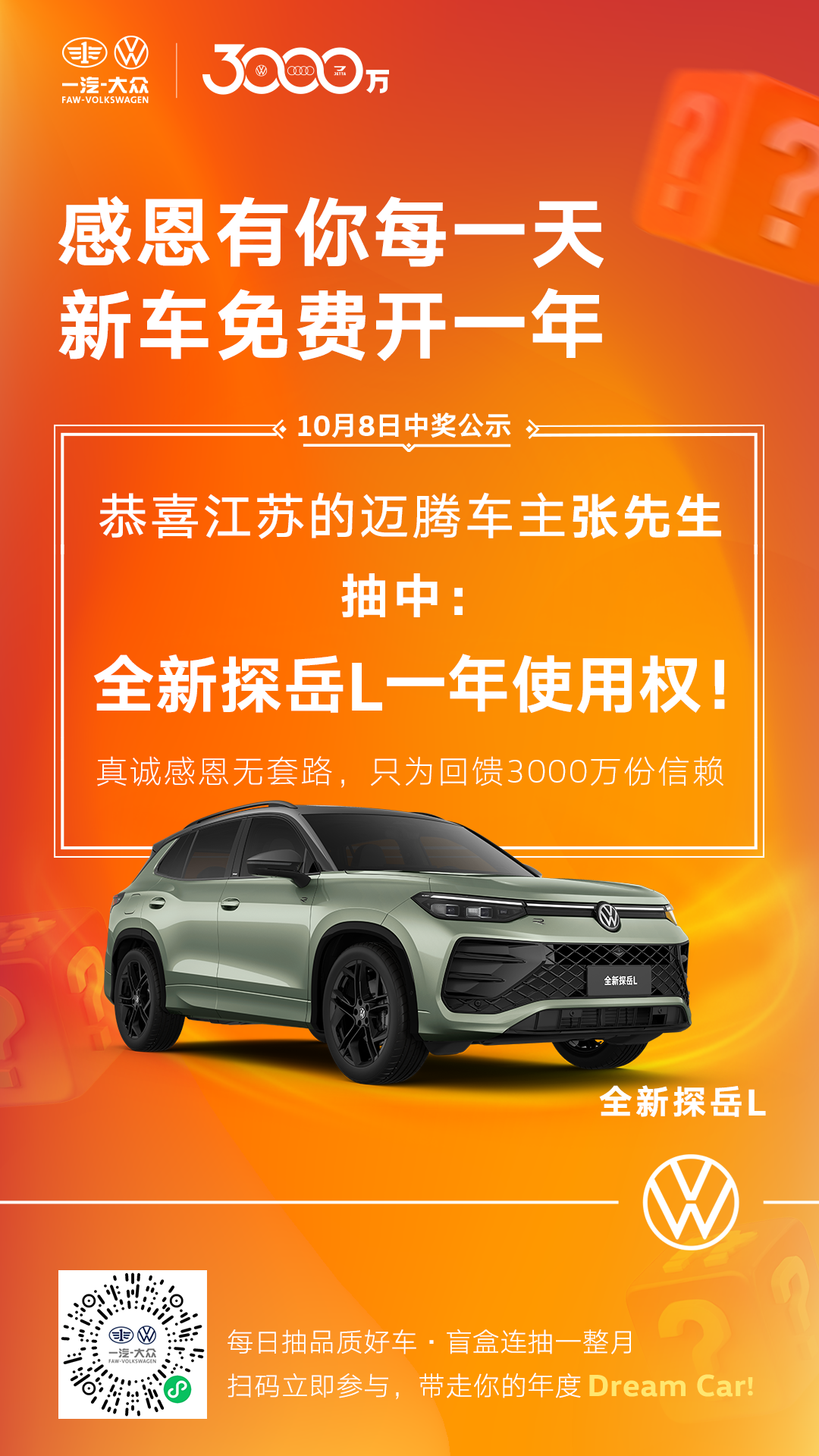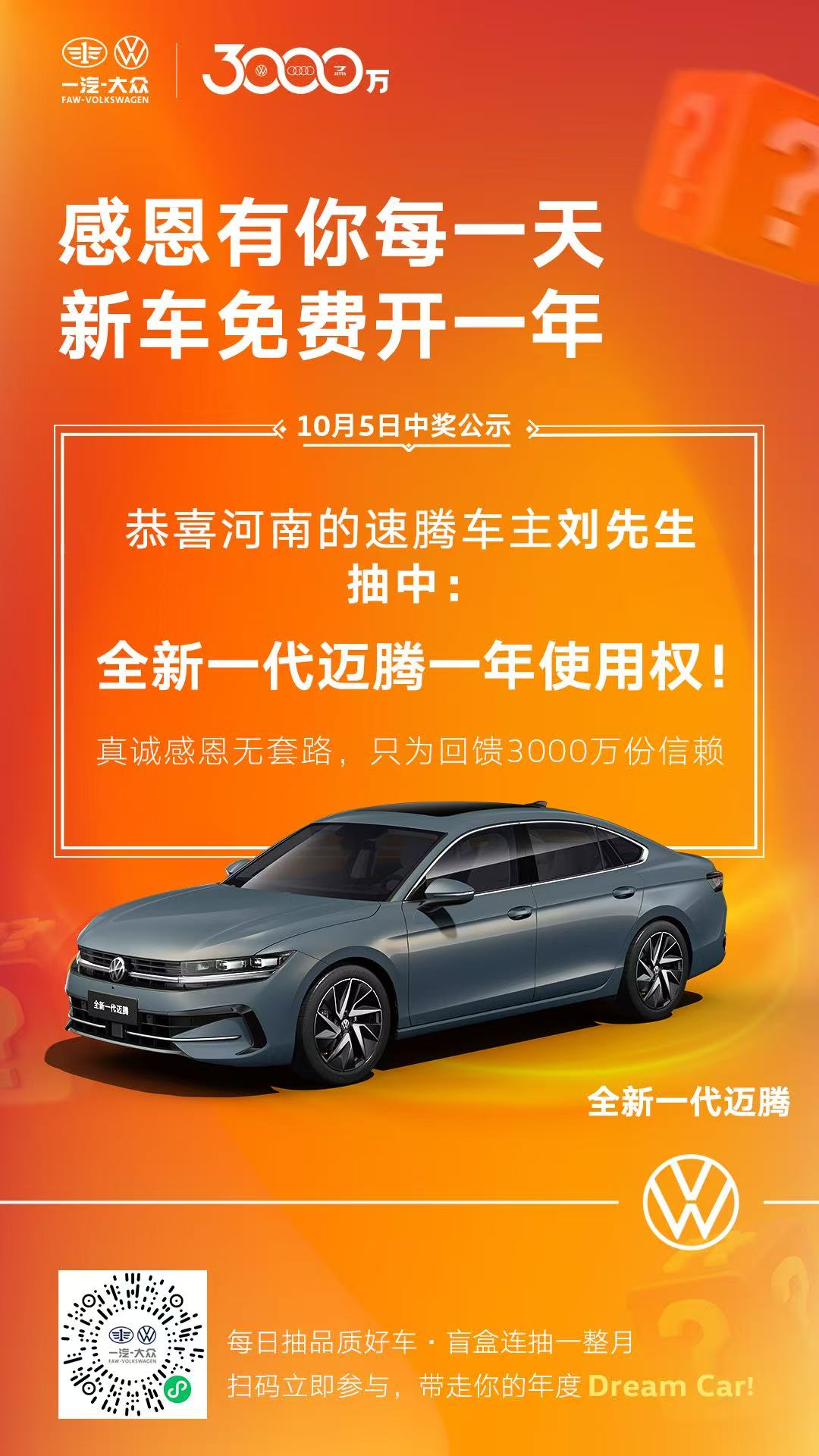 为回馈广大客户的支持与信赖,一汽-大众在即将迎来3000万辆整车下线里程碑之际,特别推出了“3000万客户感恩礼”活动,广大车主报名即可抽取新车1年使用权。一汽-大众大众品牌于10月1日-28日期间每日准时开奖、真实兑现,5大车型连送30台。自9月30日活动启动至今,已吸引超过64000位大众品牌车主报名参与,十一长假期间共诞生了八位“幸运星”,分别获得全新揽境、揽巡、全新探岳L、全新速腾L及全新一代迈腾车型的一年使用权。